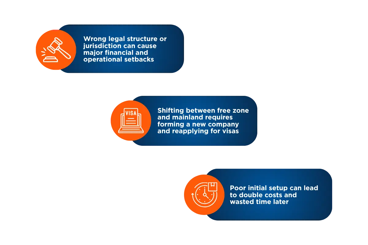 Any company has to be setup with the right legal structure and under the right jurisdiction from the outset. In UAE, relocating the company from one jurisdiction into another (e.g. from free zone to mainland or vice versa) requires setting up a completely new company and applying for residence visas and work permits for everyone from scratch. Such changes apparently will result in huge waste of money and time at the crucial stage of the business.