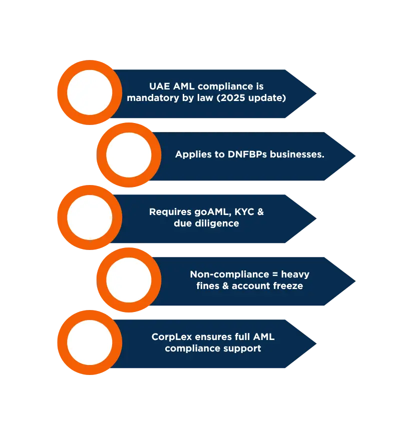 Set up your AML compliance with CorpLex. We offer end-to-end support and anti-money laundering consulting to align your DNFFBP company setup with UAE regulatory requirements.