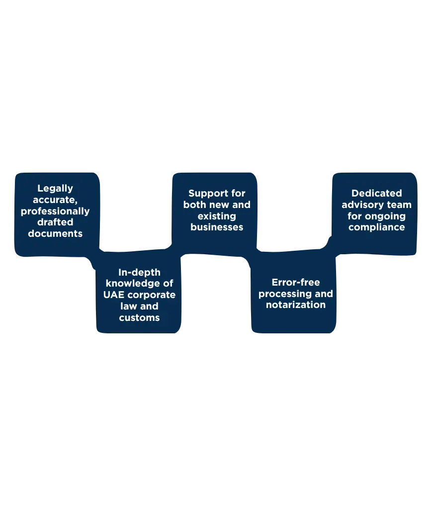 We draft legally compliant board resolutions that record company decisions such as capital increases, director appointments, and shareholder authorizations. These resolutions form part of the corporate documents list often required by banks and government departments. Notarization ensures enforceability and smooth approvals for business operations in Dubai and across the UAE.