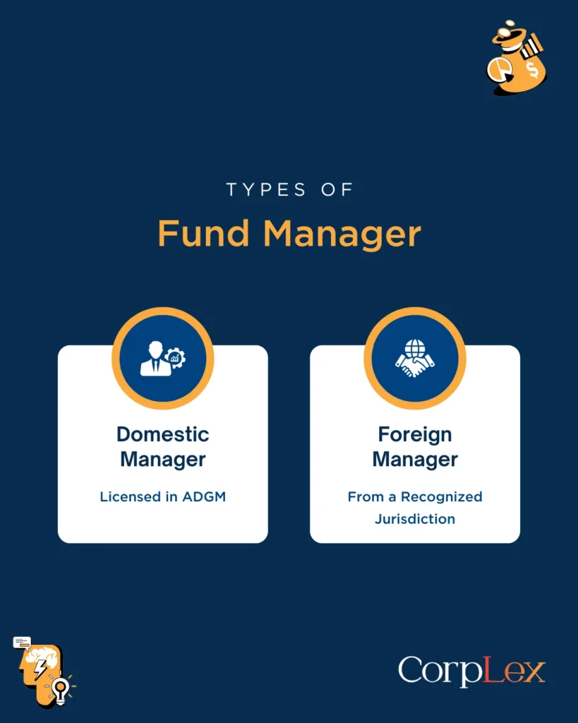 • Domestic Fund Manager is a Fund Manager who is incorporated in the ADGM and is licensed and regulated by the FSRA to provide the financial service of managing either Domestic Funds or External Funds.