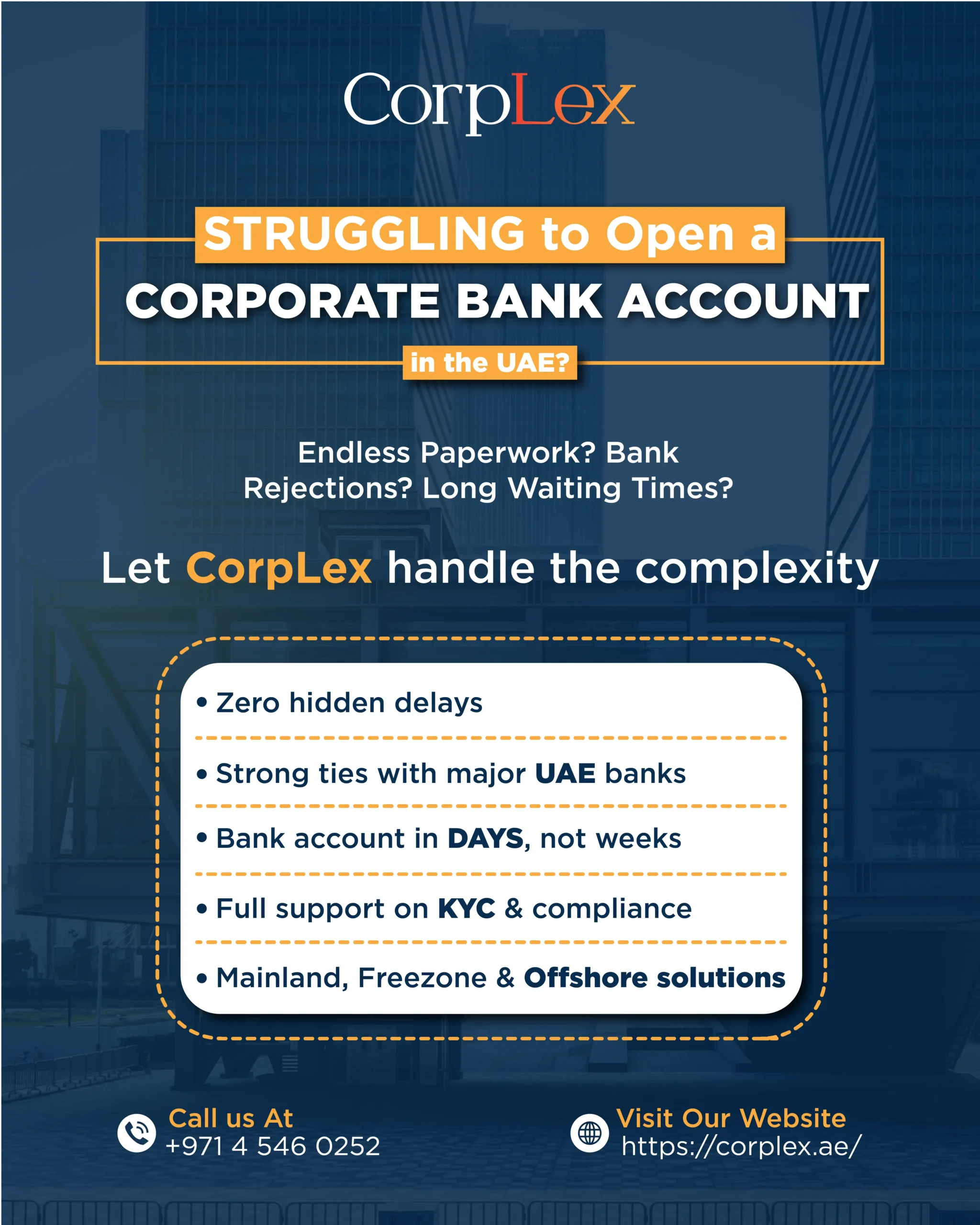 Strict banking rules, unclear requirements, and repeated rejections slow UAE account openings. CorpLex streamlines business & personal bank account opening services in Dubai, preparing accurate documents and managing approvals for residents/non-residents. Open the most suitable personal or corporate account with the best banking assistance in Dubai, UAE. Book your free consultation now.